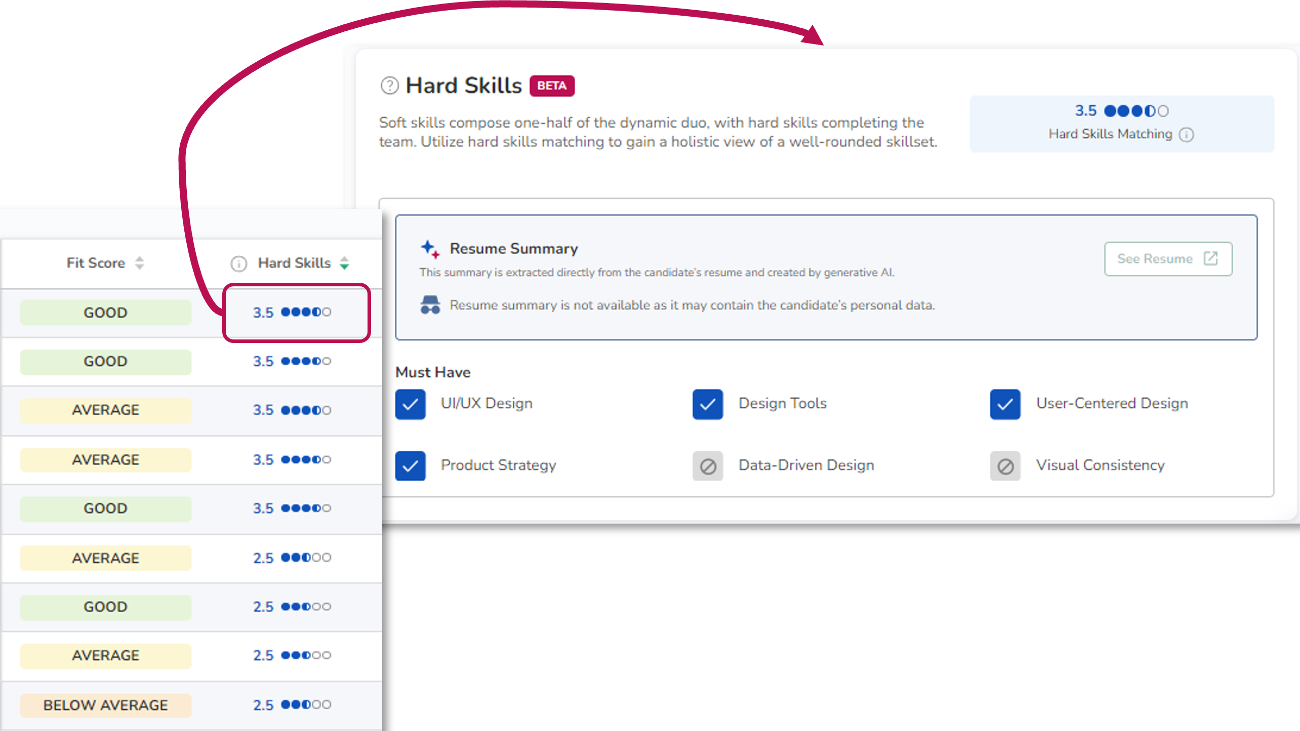 We're introducing the new Hard Skills Score—a clear and enhanced representation of a candidate's technical abilities alongside their Fit Score. This combined approach provides a more complete view of each candidate, helping you make more informed hiring decisions.