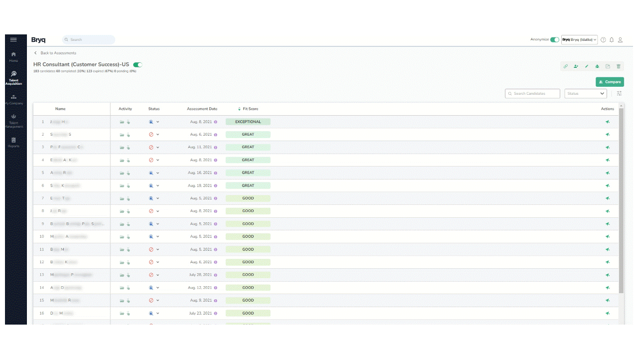 After introducing the Fit Score in the Candidate Results Page, we have integrated it into the assessment candidate table. Now, with just one glance, you can determine the alignment of the assessed candidate with the role. If you're unsure where to begin, focus on candidates with a Fit Score of "Good" and above. The default columns include Activity, Status, Assessment Date, and Fit Score. Feel free to customize your view by toggling other fields ON/OFF as needed.